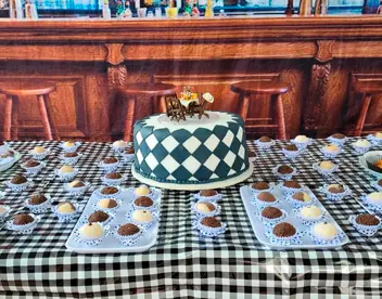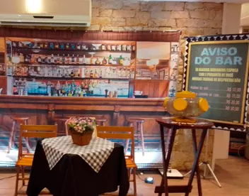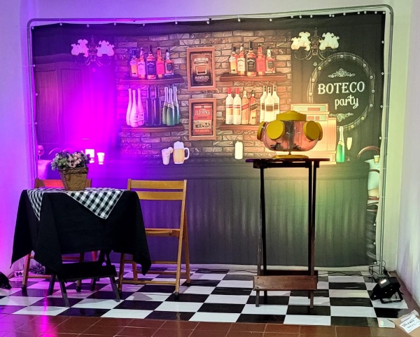 Montamos em sua festa um ambiente realmente de bar (instagramável) para que seus convidados possam tirar fotos como lembrança sem custo adicional - piso emborrachado, baleiro, mesa de bar em madeira e mesa bistrô (largura do bar: 4,50m e outro com 3m)